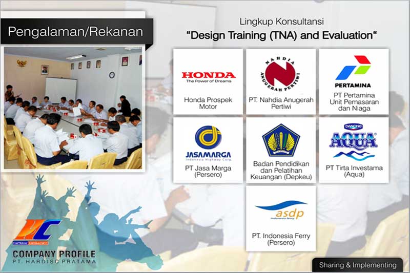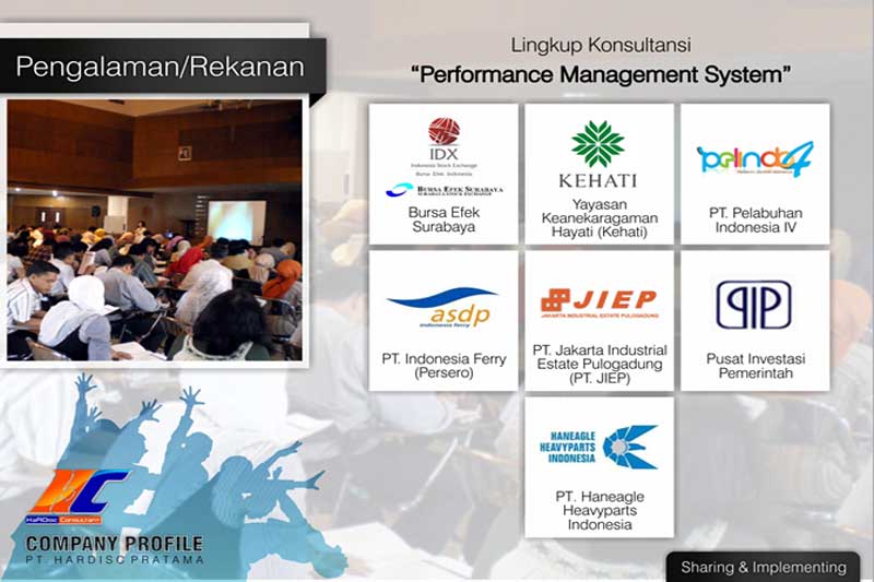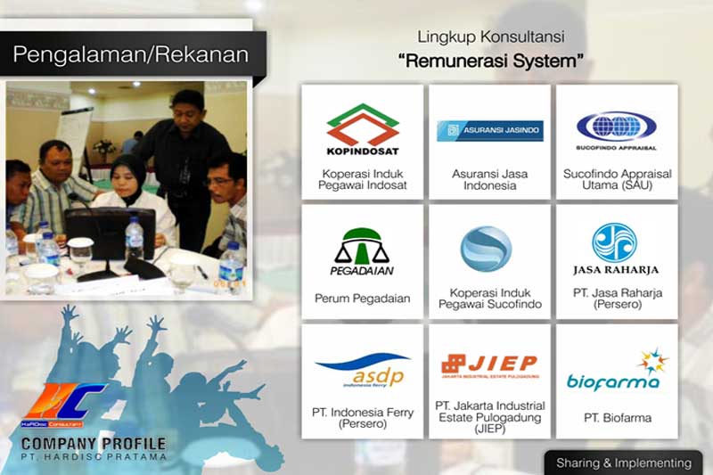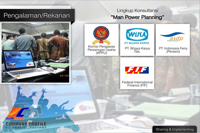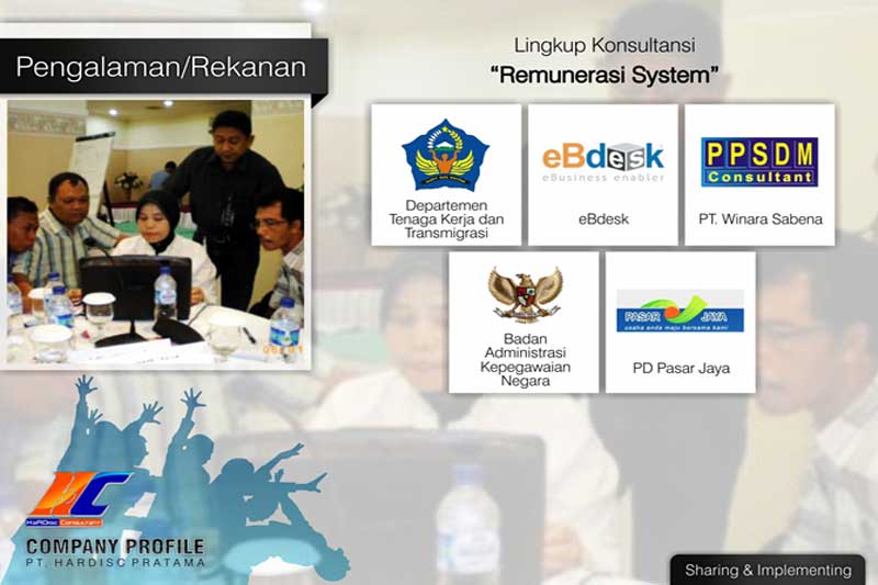 Perusahaan Kami telah banyak melakukan kegiatan konsultansi dari tahun 2004 sampai dengan sekarang. Dengan klien dari swasta maupun pemerintah, metodologi yang kami gunakan selalu mengacu pada apa yang terjadi ditempat kerja dan mengkombinasikannya dengan berbagai sumber data lain yang terkait.